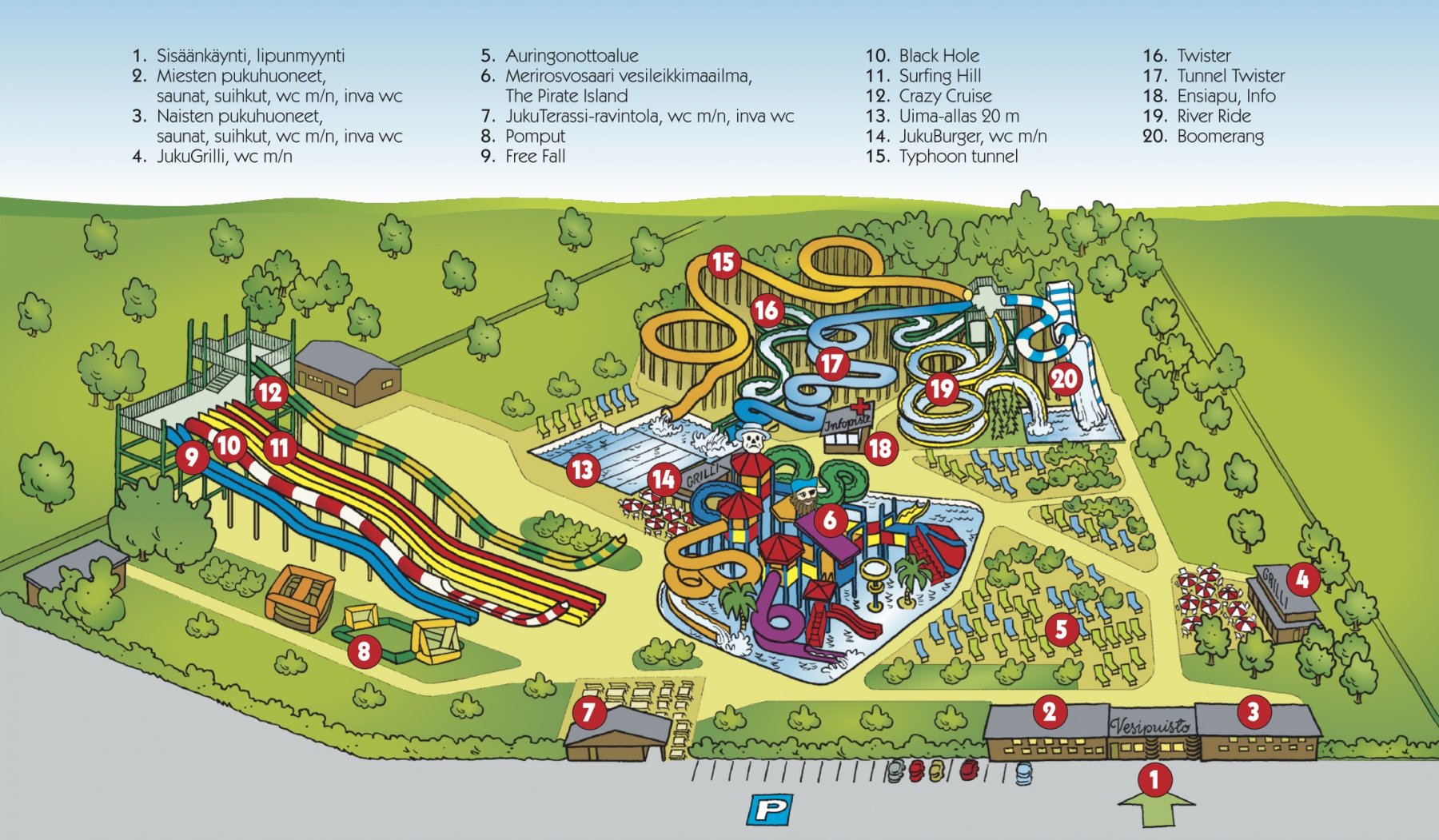 Suomen suurin interaktiivinen vesileikkimaailma Merirosvosaari, jossa on 7 erilaista vesiliukumäkeä. Merirosvosaari soveltuu niin pienille lapsille kuin perheen vesipedoille. Altaan syvyys 40 cm.
